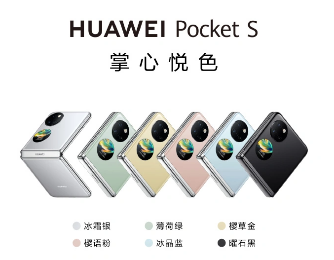 華為 Pocket S 提供六款時尚配色,包括曜石黑、冰霜銀、薄荷綠、櫻語粉、櫻草金、冰晶藍。冰霜銀使用的磨砂玻璃,手感細膩且不顯指紋。另外五款配色采用亮面玻璃,形成色澤通透的陶瓷質感,在不同的光線下,能營造出空間感和立體感。