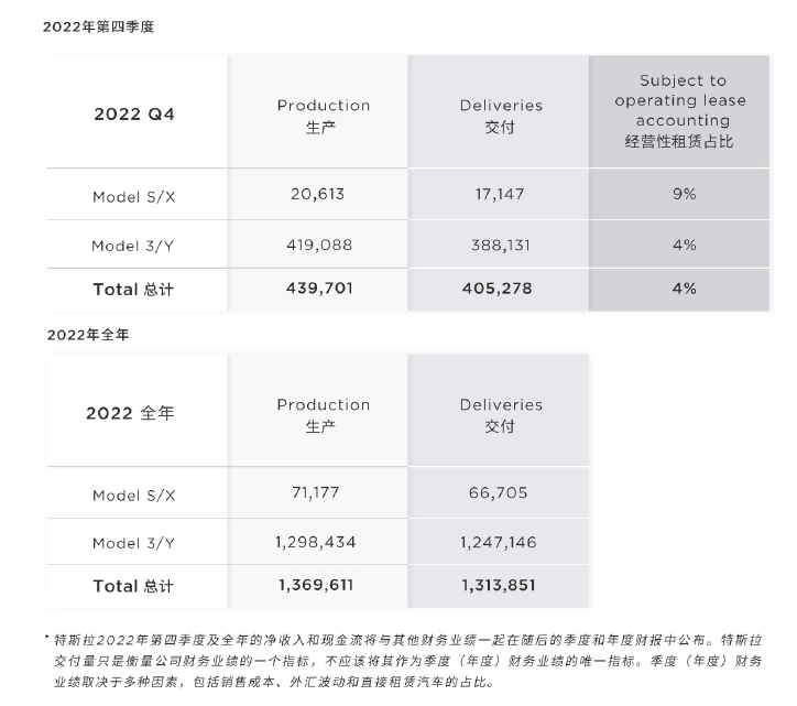 1 月 3 日消息,特斯拉數據顯示,2022 年第四季度,特斯拉全球生產了超過 43.9 萬輛汽車,交付了超過 40.5 萬輛汽車。