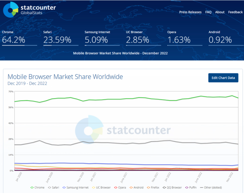 1 月 3 日消息,Statcounter 近日發(fā)布了 2022 年 12 月的瀏覽器份額報告,揭示了最新瀏覽器的份額情況。