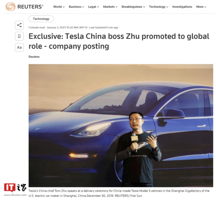 1 月 3 日消息,據(jù)路透社報(bào)道,一份內(nèi)部公告顯示,特斯拉大中華區(qū)總裁朱曉彤晉升,將擔(dān)任全球管理層職位,負(fù)責(zé)特斯拉美國(guó)生產(chǎn)業(yè)務(wù)以及北美和歐洲的銷售業(yè)務(wù)。