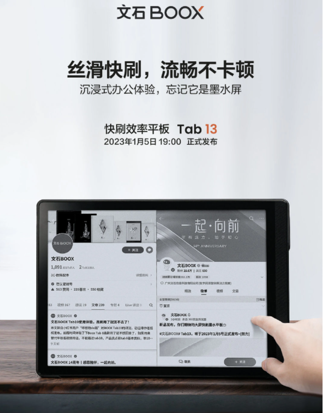 1 月 3 日消息,文石大屏墨水平板 Tab13 將在 1 月 5 日發布。據官方最新的預熱信息,這款墨水平板主打快刷,實現“流暢不卡頓”,可用于沉浸式辦公。
