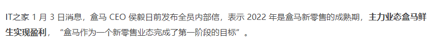 1 月 3 日消息,盒馬 CEO 侯毅日前發布全員內部信,表示 2022 年是盒馬新零售的成熟期,主力業態盒馬鮮生實現盈利,“盒馬作為一個新零售業態完成了第一階段的目標”。