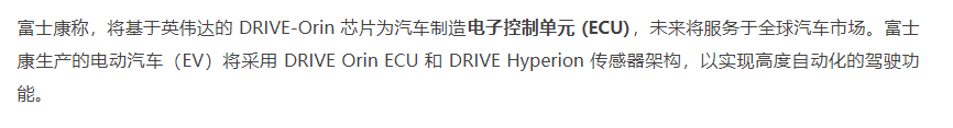富士康稱,將基于英偉達的 DRIVE-Orin 芯片為汽車制造電子控制單元 (ECU),未來將服務于全球汽車市場。富士康生產的電動汽車(EV)將采用 DRIVE Orin ECU 和 DRIVE Hyperion 傳感器架構,以實現高度自動化的駕駛功能。