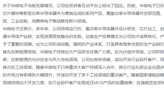 關于華微電子當前發展情況,公司在投資者互動平臺上給出了回應。目前,華微電子已形成以IGBT、MOSFET、SCR、SBD、IPM、FRD、BJT、多芯片模塊等新型功率半導體器件為營銷主線的系列產品,覆蓋功率半導體器件全部范圍,同時,旗下產品正在被廣泛應用于新能源汽車、光伏、變頻、工業控制、消費類電子等戰略性新興領域。