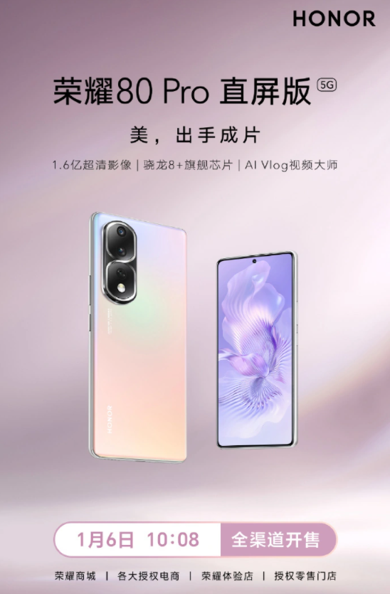 1 月 6 日消息,榮耀手機官方推出榮耀 80 Pro 直屏版,于 1 月 6 日 10 : 08 全渠道開售。該機采用 1.6 億像素超清影像,搭載驍龍 8+ Gen 1 芯片,支持 AI Vlog 視頻大師,6 大場景智慧識別功能。目前該機已上架京東商城,顯示 12GB+256GB 售價 3599 元。