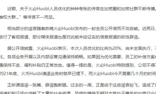 近期,關于火必Huobi人員優化的種種夸張的傳言在加密圈和加密社群不斷傳播。“裁員40%、換簽后被裁人員無法要求N+1補償、400人員工維權大群…”等傳言不一而足。