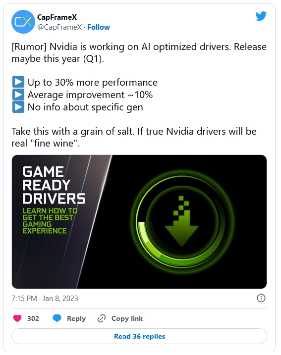 1 月 9 日消息,根據(jù)網(wǎng)友 CapFrameX 爆料,英偉達(dá)正在利用人工智能來優(yōu)化驅(qū)動(dòng)更新。消息稱經(jīng)由 AI 優(yōu)化的驅(qū)動(dòng)將于今年第 1 季度推出,游戲性能表現(xiàn)最高可以提升 30%,平均提升在 10% 左右。
