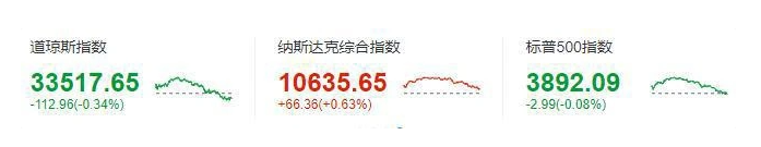 道瓊斯指數(shù)收于 33517.65 點,下跌 112.96 點,跌幅 0.34%,盤中一度上漲近 305 點;標(biāo)準(zhǔn)普爾 500 指數(shù)收于 3892.09 點,跌幅 0.08%;納斯達(dá)克指數(shù)收于 10635.64 點,漲幅 0.63%。