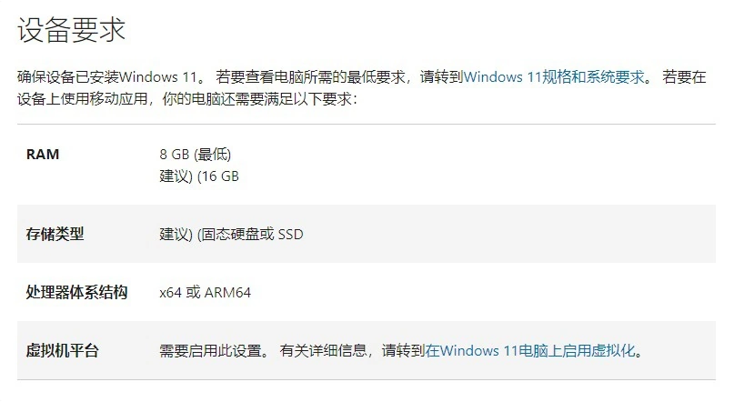 IT之家小伙伴目前想要在 Win11 設備上運行 WSA 子系統還存在一定的門檻,微軟官方給出的推薦運行設備配置為: