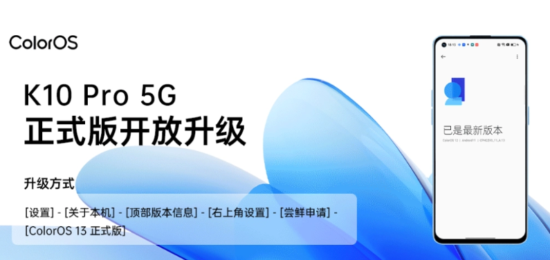 1 月 11 日消息,OPPO K10 Pro 5G 手機開啟正式版更新,支持升級到全新的 ColorOS 13.0 x Android 13 系統。
