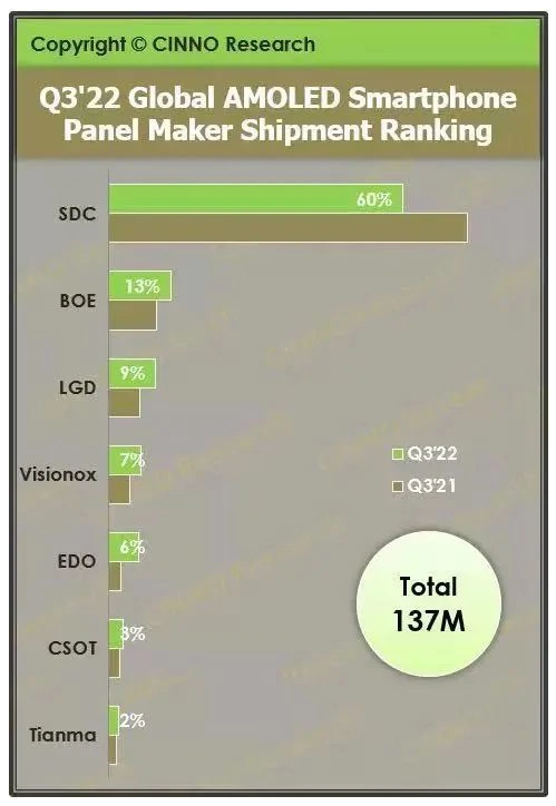 原標題:CINNO 研究:2022 年 Q3 國產智能手機 OLED 面板份額已達全球 30%,PWM 高頻調光技術彎道超車