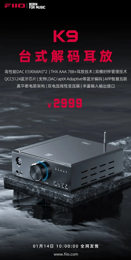 1 月 12 日消息,此前飛傲 K9 Pro 已發布,但高昂的售價令一些用戶望而卻步。現在,飛傲臺式解碼耳放 K9 已發布,售價 2999 元,1 月 14 日 10 點開售。