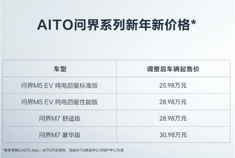 1 月 13 日消息,AITO 汽車宣布,自 2023 年 1 月 13 日 08 點 30 分開始,問界系列部分車型將帶來新年新價格,對部分車型降價 3 萬元左右,新價格為: