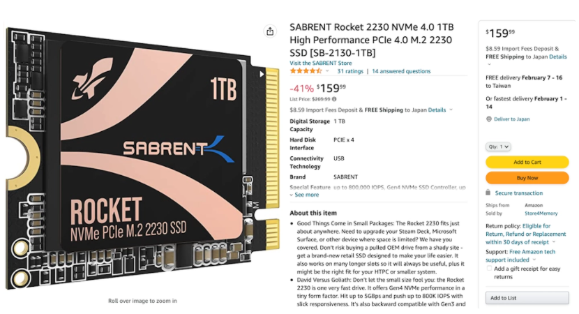 1 月 15 日消息, Sabrent 在去年底發布了一款 Rocket M.2 2230 固態硬盤,可選 1TB 容量,適合 Steam Deck、微軟 Surface 和一些超級本升級使用。現在,這款 SSD 已經在亞馬遜上市,1TB 售價 160 美元(當前約 1075 元人民幣)。
