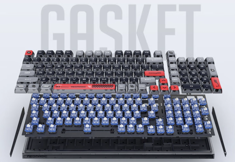 紅魔電競機械鍵盤采用懸浮 PBT 鍵帽,支持有線、藍牙、2.4GHz 三模連接,采用 Gasket 結構,可消除敲擊共振。
