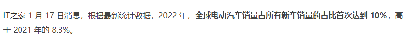 1 月 17 日消息,根據(jù)最新統(tǒng)計(jì)數(shù)據(jù),2022 年,全球電動(dòng)汽車(chē)銷(xiāo)量占所有新車(chē)銷(xiāo)量的占比首次達(dá)到 10%,高于 2021 年的 8.3%。