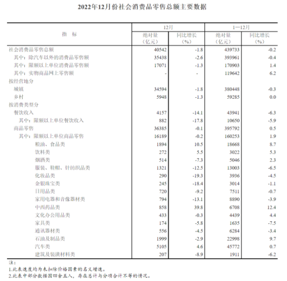 整體來看,2022 年 12 月,社會消費品零售總額 40542 億元,同比下降 1.8%。其中,除汽車以外的消費品零售額 35438 億元,下降 2.6%。2022 年,社會消費品零售總額 439733 億元,比上年下降 0.2%。其中,除汽車以外的消費品零售額 393961 億元,下降 0.4%。