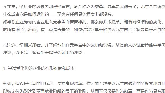 他所看到的是,許多情況下,高管在討論元宇宙時(shí)使用的描述表明,他們雖然覺(jué)得有必要使用這個(gè)流行語(yǔ),但并未真正掌握它的整體含義。對(duì)于他們的業(yè)務(wù)來(lái)說(shuō),情況更是如此。
