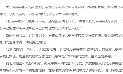 “一些高管認(rèn)為,我們已經(jīng)跨越了元宇宙這個(gè)門(mén)檻。他們的結(jié)論似乎為時(shí)尚早。今天,不到1/14的人經(jīng)常接觸虛擬世界,而這些虛擬世界幾乎完全是游戲形式的,就算有相互連接,也沒(méi)有任何意義,對(duì)整個(gè)社會(huì)的影響微乎其微。”