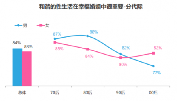 83%的被訪者認(rèn)為和諧的性生活在幸?;橐鲋泻苤匾?,分代際看,隨著年齡減小,認(rèn)為和諧性生活很重要的占比呈下降趨勢(shì)。其中,70后-90后的男性相較女性都更認(rèn)可和諧性生活的重要性,而到了00后,轉(zhuǎn)變?yōu)榕愿J(rèn)可和諧性生活的重要性,這或許與性觀念逐漸開(kāi)放和女性意識(shí)覺(jué)醒相關(guān)。