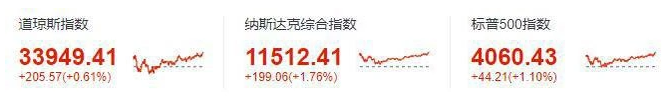 道瓊斯指數(shù)收于 33949.41 點(diǎn),上漲 205.57 點(diǎn),漲幅 0.61%;標(biāo)準(zhǔn)普爾 500 指數(shù)收于 4060.43 點(diǎn),漲幅 1.10%;納斯達(dá)克指數(shù)收于 11512.41 點(diǎn),漲幅 1.76%。