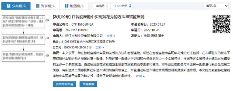 1 月 29 日消息,據國家知識產權局官網信息,1 月 24 日,浙江吉利控股集團有限公司、吉利汽車研究院 (寧波) 有限公司申請的“在智能座艙中實現煙花秀的方法和智能座艙”專利公布。