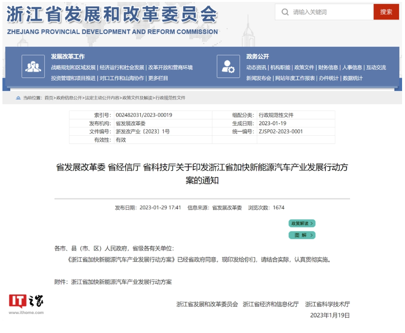 1 月 30 日消息,據浙江省發展改革委網站,浙江省發展改革委、浙江省經信廳、浙江省科技廳近日印發了《浙江省加快新能源汽車產業發展行動方案》(以下簡稱《方案》)。