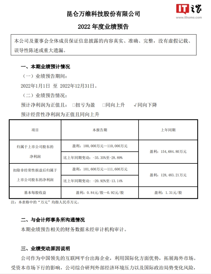 1 月 31 日消息,昆侖萬維昨日晚間發(fā)布報告,披露了 2022 年業(yè)績預(yù)告。