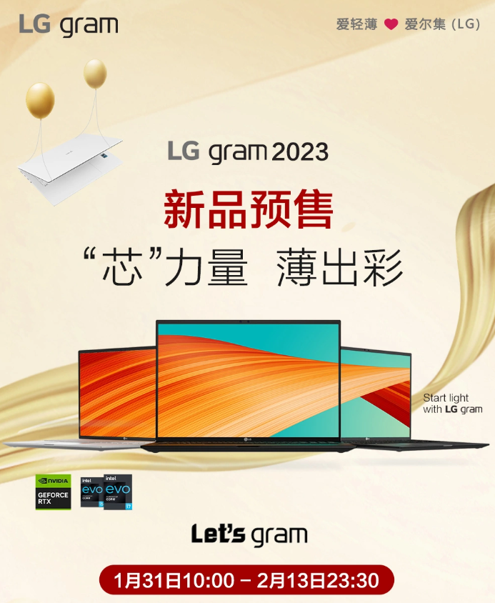 1 月 31 日消息,LG gram 2023 款 13代酷睿新品預售已開啟,2 月 14 日開售(付尾款),定金 200 元抵 1000 元。LG gram 2023 款分為 16 英寸和 17 英寸兩種版本。