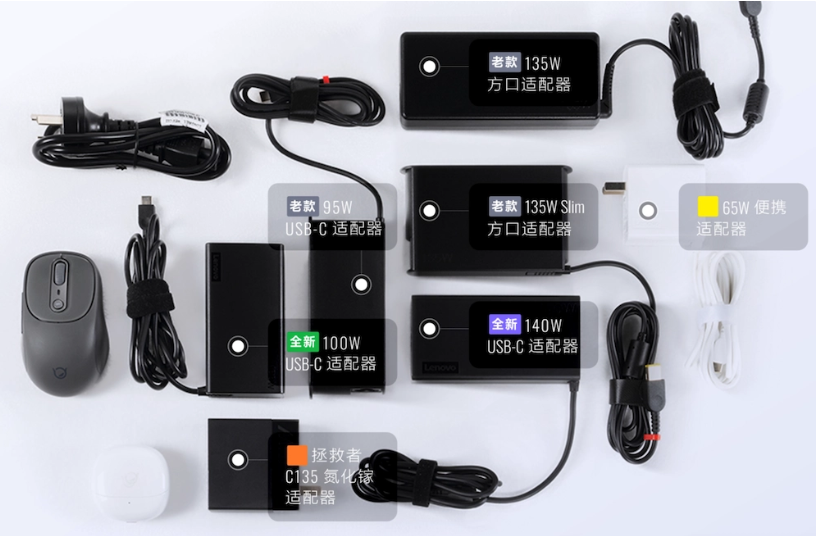 聯想官方表示,新款 100W USB-C 適配器體積減小 20%,重量降低 15%;新款 140W 適配器采用的是聯想私有協議,支持 100W PD 輸出,相比老款重量降低 7%。