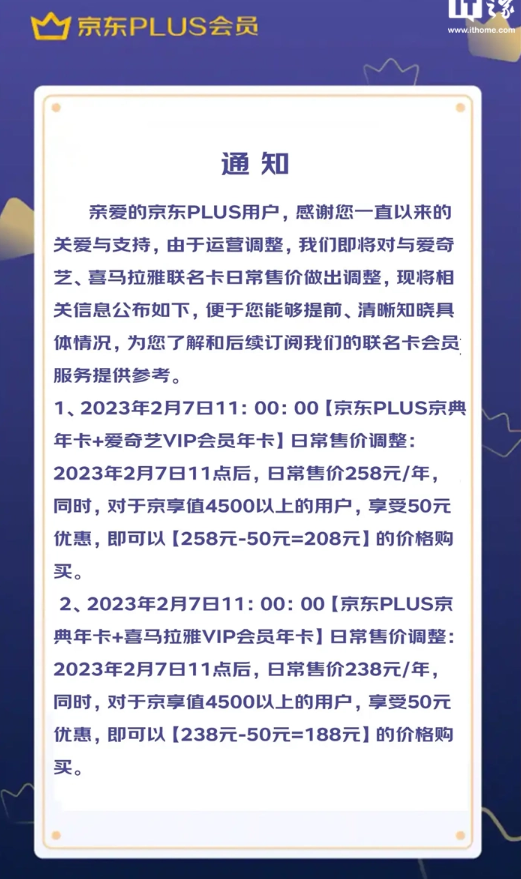 2 月 2 日消息,京東 PLUS 會員官方現已發布通知稱,由于運營調整,即將對與愛奇藝、喜馬拉雅聯名卡日常售價做出調整。