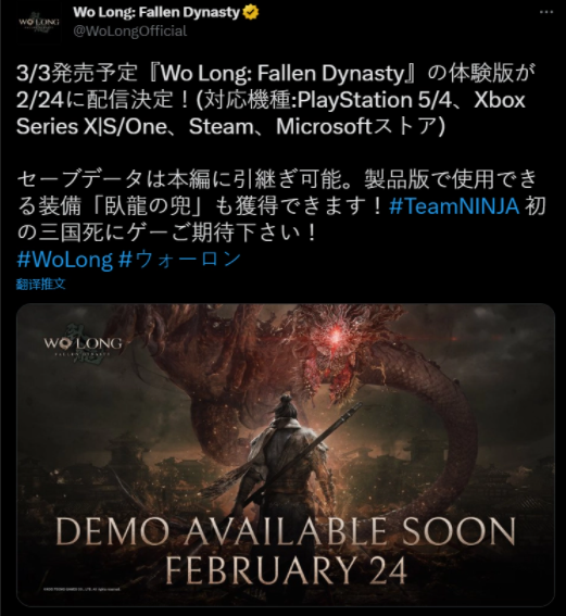 此外,官方還將在 2 月 24 日進(jìn)行游戲演示,通關(guān)后還可獲得能繼承至正式版的裝備獎(jiǎng)勵(lì)“臥龍兜鍪”!