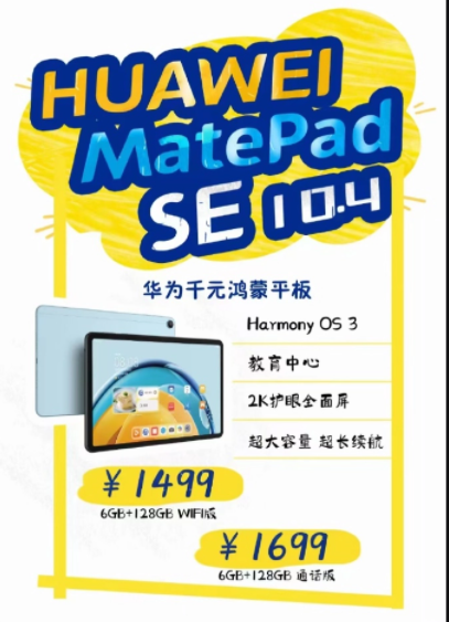 該機搭載了高通驍龍 680 芯片,配備 10.4 英寸 2K 護眼屏,升級 HarmonyOS 3 系統,配色也從深海藍改成了更淺的海島藍色,擁有 WiFi 版和通話版兩種型號,但依然僅有 6+128GB 一種存儲版本,分別為 1499 元和 1699 元。