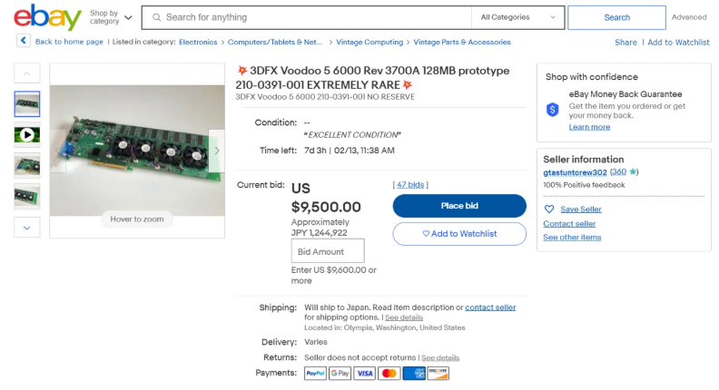 2 月 6 日消息,eBay 上出現了一款從未發布的 3dfx 顯卡的工程樣品 ——Voodoo 5 6000 3700A,目前已經拍賣到 9500 美元,不過有一位已經退出拍賣的用戶在退出前曾出價 10100 美元。