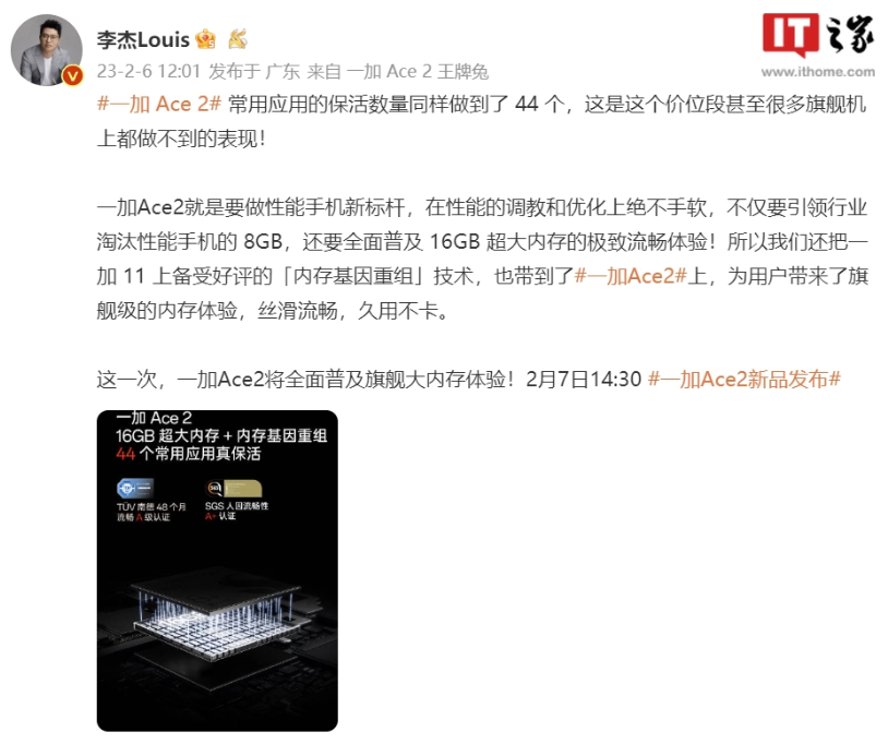 原標題:一加中國區總裁李杰:Ace 2 支持內存基因重組技術,常用應用保活數量可達 44 個