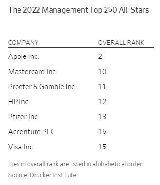 2 月 7 日消息,據華爾街日報報道,在最新的“管理 250 強”排名中,有 7 家公司因在客戶滿意度、員工敬業度和發展、創新、社會責任和財務實力這 5 個方面的卓越表現而被評為“全明星”,蘋果公司位居“全明星”榜首,其余 6 家公司分別為萬事達公司、寶潔公司、惠普公司、輝瑞公司、埃森哲公司以及 Visa 公司。