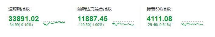 道瓊斯指數(shù)收于 33891.02 點,下跌 34.99 點,跌幅 0.10%,盤中一度下跌 242 點;標準普爾 500 指數(shù)收于 4111.08 點,跌幅 0.61%;納斯達克指數(shù)收于 11887.45 點,跌幅 1.00%。