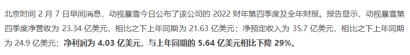 2 月 7 日消息,動視暴雪今日公布了該公司的 2022 財年第四季度及全年財報。報告顯示,動視暴雪第四季度凈營收為 23.34 億美元,相比之下上年同期為 21.63 億美元;凈預定收入為 35.7 億美元,相比之下上年同期為 24.9 億美元;凈利潤為 4.03 億美元,與上年同期的 5.64 億美元相比下降 29%。