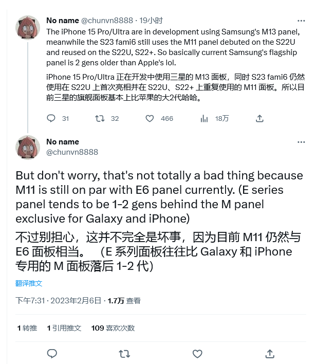 推文中表示,Galaxy S22 / S23 系列目前使用的是 M11 面板,也就是說三星 Galaxy S23 系列和 iPhone 15 Pro 系列的屏幕面板工藝相差 2 代。
