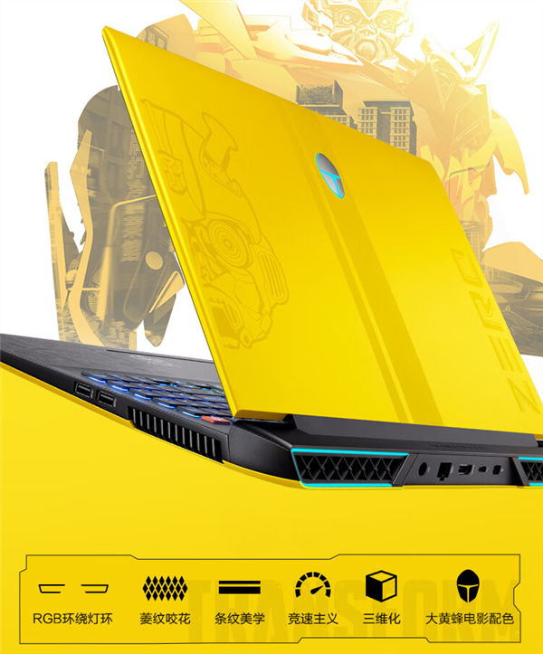 新款筆記本的外觀設計十分搶眼,擁有《變形金剛》IP 正版授權,采用“啟世”旗艦 ID 設計語言,擁有環繞燈帶、大黃蜂電影級1:1還原配色、A面IP聯合定制圖案。