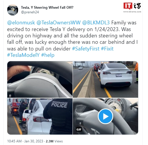 1 月 30 日,該車主 Priorak Patel 表示,他的 Model Y 的方向盤在 1 月 24 日交付后僅僅 6 天就從車輛的轉向柱上斷開,并且當時他和他的家人在高速公路上行駛,方向盤突然斷開,情況非常危險,不過好在他們最終安全地將車在路邊停了下來。