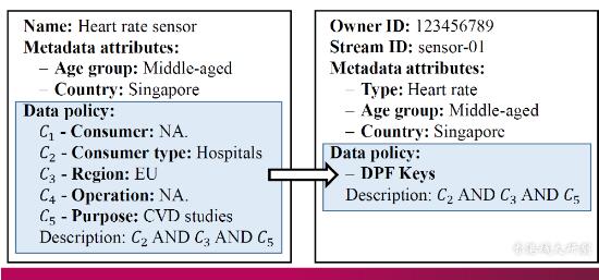 使用心率傳感器收集數(shù)據(jù)的處理流程示例(圖左),以及在訂定數(shù)據(jù)取用條件下的安全數(shù)據(jù)轉(zhuǎn)換(即數(shù)據(jù)取用要求,圖右)。Vizard在系統(tǒng)內(nèi)保留了部分公共元數(shù)據(jù)(包括這次例子中的年齡組別和國家),以促進不同數(shù)據(jù)流程的處理分組及過濾。