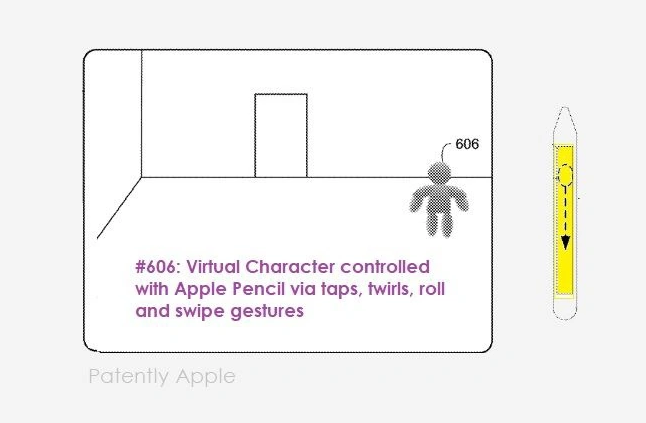 IT之家摘要了該專利的主要內容如下:在下面的圖 1 和圖 6B 上,我們看到一個用戶拿著 Apple Pencil,在這種情況下,它被用作游戲控制器來移動對象或游戲角色,蘋果稱之為“虛擬代理”(Virtual Agent)#606.Apple Pencil 的功能將包括涉及在 Pencil 的觸摸表面上敲擊、滾動、旋轉、輕彈和滑動的輸入。