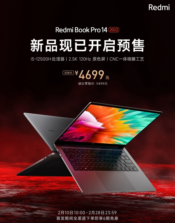 今天,小米宣布搭載 i5-12500H 標壓處理器的新款 RedmiBook Pro 14 2022 開啟預售,首發價 4699 元,活動期間下單即享 6 期免息。
