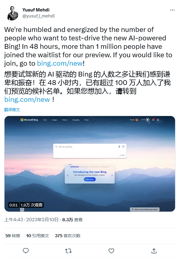 2 月 10 日消息,微軟于本周二推出了整合 ChatGPT-4 的全新必應(Bing)搜索引擎,根據微軟企業副總裁兼消費領域首席營銷官 Yusuf Mehdi 公布的最新推文,在新版 Bing 上線 48 小時內,已經有超過 100 萬申請加入。