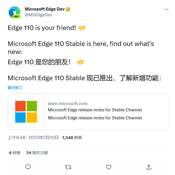 2 月 10 日消息,微軟于今天發(fā)布了 Microsoft Edge 110 穩(wěn)定版更新。本次更新主要引入全新的 Immersive Reader 策略,為用戶同步 Azure Active Directory 登錄和引入 Drop 功能。