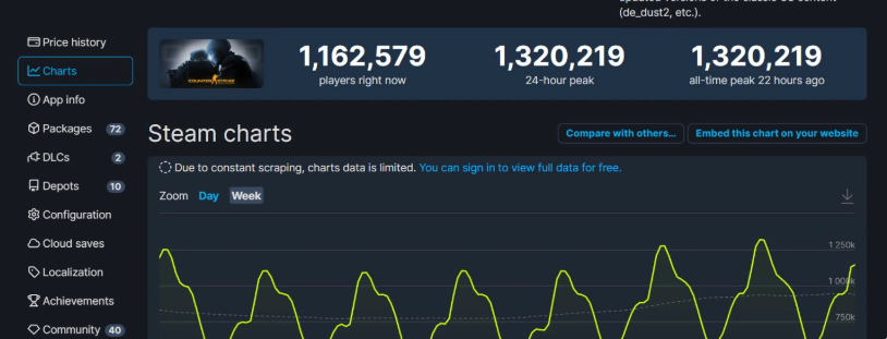 2 月 13 日消息,據 SteamDB 統計,目前 Steam 上最熱門的游戲《反恐精英:全球攻勢》在線人數再創新高,本周末達到了 132 萬 219 人同時在線的新高度,這也是自 2020 年 4 月以來最高的一次。