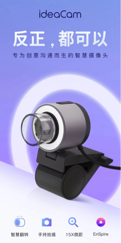 此外,ideaCam 支持手持移動拍攝,而且底座配備了 1/4 螺口,可搭配腳架使用;人物 / 實物更可快速識別,自動感應調節畫面方向。