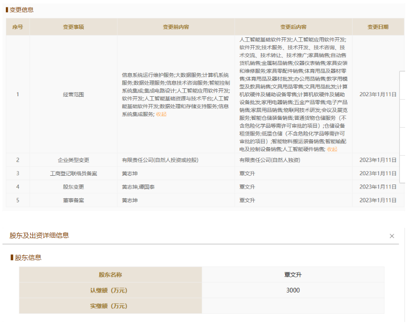 除此之外,工商信息顯示該公司企業(yè)類型由“有限責(zé)任公司 (自然人投資或控股)”變?yōu)椤坝邢挢?zé)任公司 (自然人獨(dú)資)”,而原股東黃志坤、譚國泰退出,改由覃文升全資持股;而且該公司法定代表人、執(zhí)行董事兼經(jīng)理由黃志坤變更為覃文升。