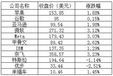 道瓊斯指數收于 34245.93 點,上漲 376.66 點,漲幅 1.11%;標準普爾 500 指數收于 4137.29 點,漲幅 1.14%;納斯達克指數收于 11891.78 點,漲幅 1.48%。